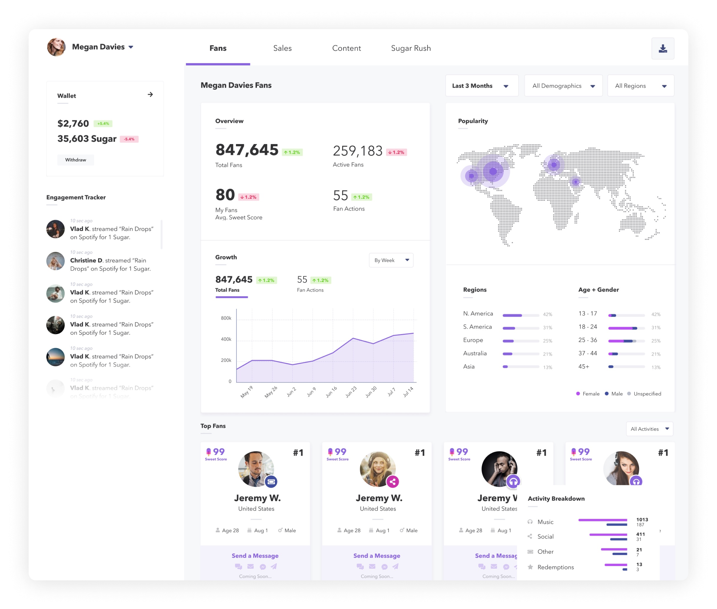 We worked with Sweet to design a fan, content, and sales management dashboard for musicians and artists.